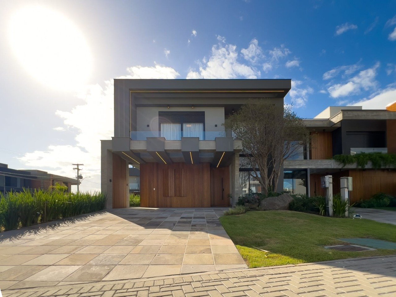 O sobrado descrito apresenta características de destaque no mercado imobiliário, especialmente no litoral, onde a procura por residências de alto padrão é crescente. A localização privilegiada dentro do condomínio, próximo ao clube central, é um diferencial importante, assim como o design moderno que combina concreto aparente com detalhes em madeira de alta qualidade. A estrutura do sobrado oferece conforto e privacidade com suas quatro suítes amplas, incluindo uma suíte térrea, e a suíte Master com sacada. A integração do living com a cozinha americana e a varanda externa cria um ambiente acolhedor e ideal para o convívio social, enquanto a lareira acrescenta um charme especial para os dias mais frios. O paisagismo cuidadosamente planejado e os espaços externos, como o pátio e a garagem para dois carros, complementam o alto padrão deste imóvel. Este sobrado é uma opção excelente para quem busca uma residência sofisticada e confortável no litoral.