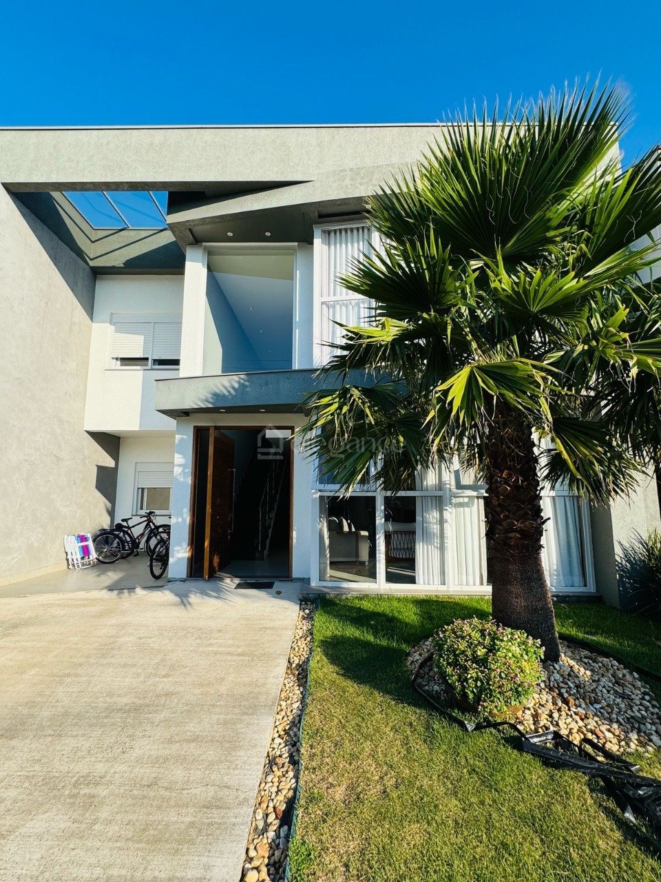 Possui 4 dormitórios, sendo 3 suítes, living amplo em 2 ambientes com lareira, cozinha integrada, mezanino com espaço de TV e home office, churrasqueira externa, lavanderia, pátio privativo com deck e piscina, paisagismo e vaga para carros. 220m²