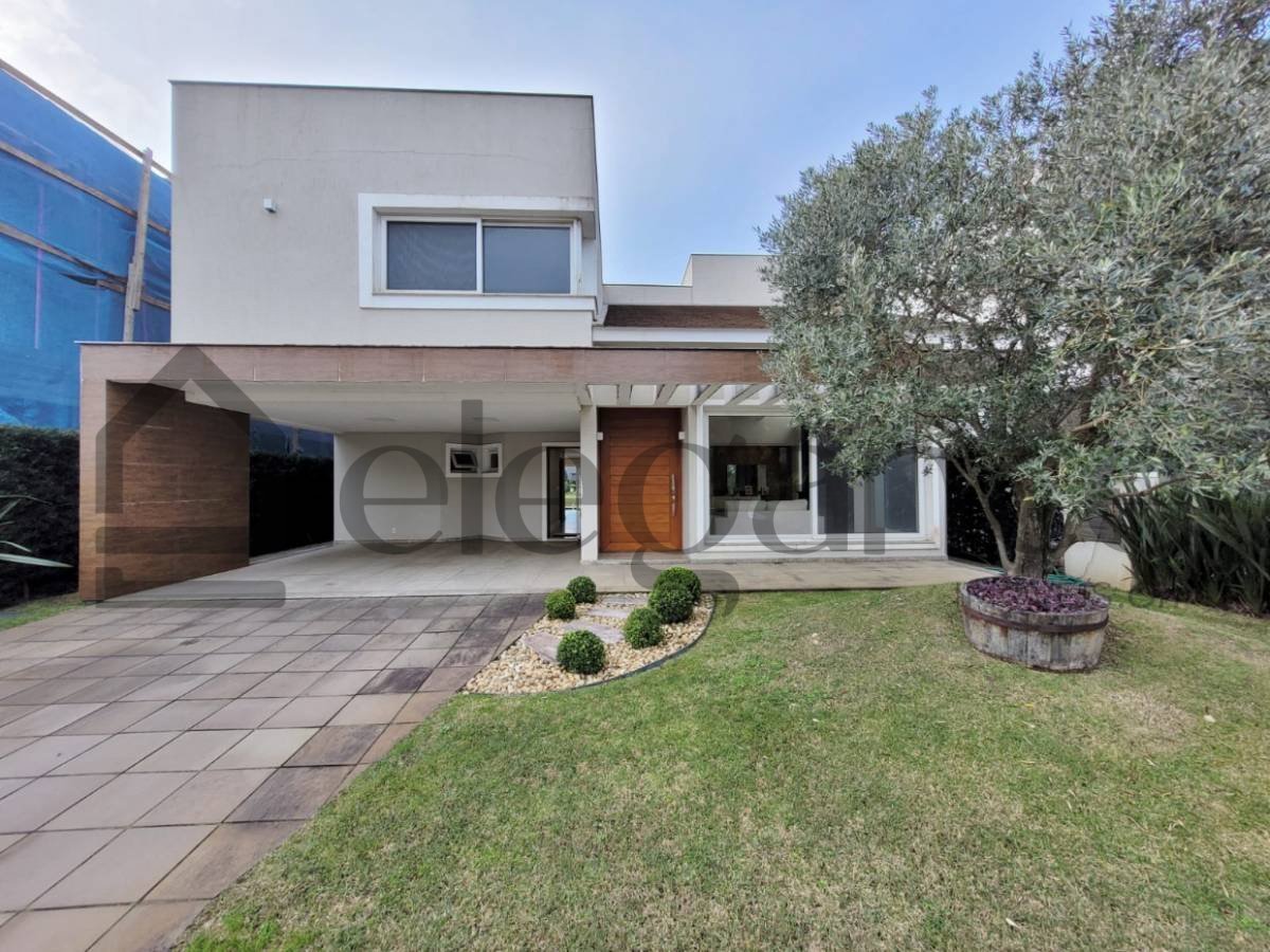 Elegante sobrado beira lago no condomínio, composto por 4 suítes, sendo 1 master e 1 térrea, amplo living com 2 ambientes, lareira, lavabo, cozinha integrada, churrasqueira, lavanderia, paisagismo e piscina.