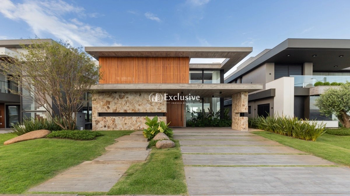 Sobrado à venda no condomínio 427,00m² de área construída; Deck junto ao lago com 55m²; Piscina de concreto com 28m² com borda infinita; 06 suítes, sendo a Suíte Master com closet e uma suíte transformada em sala de cinema. 02 vagas de garagem com depósito em anexo; Espera para elevador; Dependência de funcionários; Living amplo com 3 ambientes integrados; Cozinha Gourmet com churrasqueira; Cozinha auxiliar; Despensa; Área de serviço; Lavabo social e Lavabo de Piscina; Esquadrias de PVC preto, todas com vidro temperado e dormitórios com persianas motorizadas e tela de mosquito; Esquadrias da varanda 100% embutida dentro da parede e piso da varanda com o mesmo nível do piso interno; Todos os banhos com piso aquecido e box de vidro até o teto; Todos os pisos e revestimentos utilizados são Classe "A"; Ripados de madeira; Esperas prontas para geração de energia fotovoltaica; Tomada para carro ou patinete elétrico; Paisagismo com irrigação instalada; Marcenaria, móveis soltos e decorações.