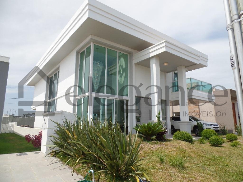 Elegante casa de alto padrão em Condomínio Fechado, semimobiliada, com 4 suítes, sendo 1 máster, living em 3 ambientes com lareira, lavabo, cozinha americana com espaço gourmet e churrasqueira, área de serviço, abrigo para carro.
