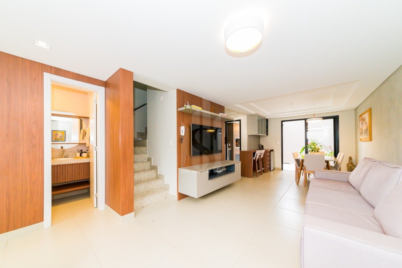 Simplesmente encantador, e muito aconchegante este sobrado em condomínio fechado. Sala ampla, design moderno com excelente iluminação natural, muita luz solar, 03 quartos sendo 01 suíte, uma cozinha encantadora e um espaço gourmet com churrasqueira a carvão para viver momentos afetivos com toda a família. Móveis planejados na cozinha e quartos deixam os ambientes mais aconchegantes. Completo, elegante e muito bem localizado. CARACTERÍSTICAS: - 104m2 de área privativa - 118m2 de área total - Sala de estar - Sala de jantar - Lavabo - Cozinha - 03 Quartos sendo 01 suíte - Área de serviço - Espaço gourmet - 02 Vagas de garagem DIFERENCIAIS: - Espaço gourmet com churrasqueira a carvão - Face norte - Móveis planejados - Aquecimento a gás - Gesso - Granito - Piso porcelanato - Piso laminado CONDOMÍNIO: - Portaria - Sistema de segurança - Câmeras de vigilância - Playground - Salão de festas Agende sua visita.