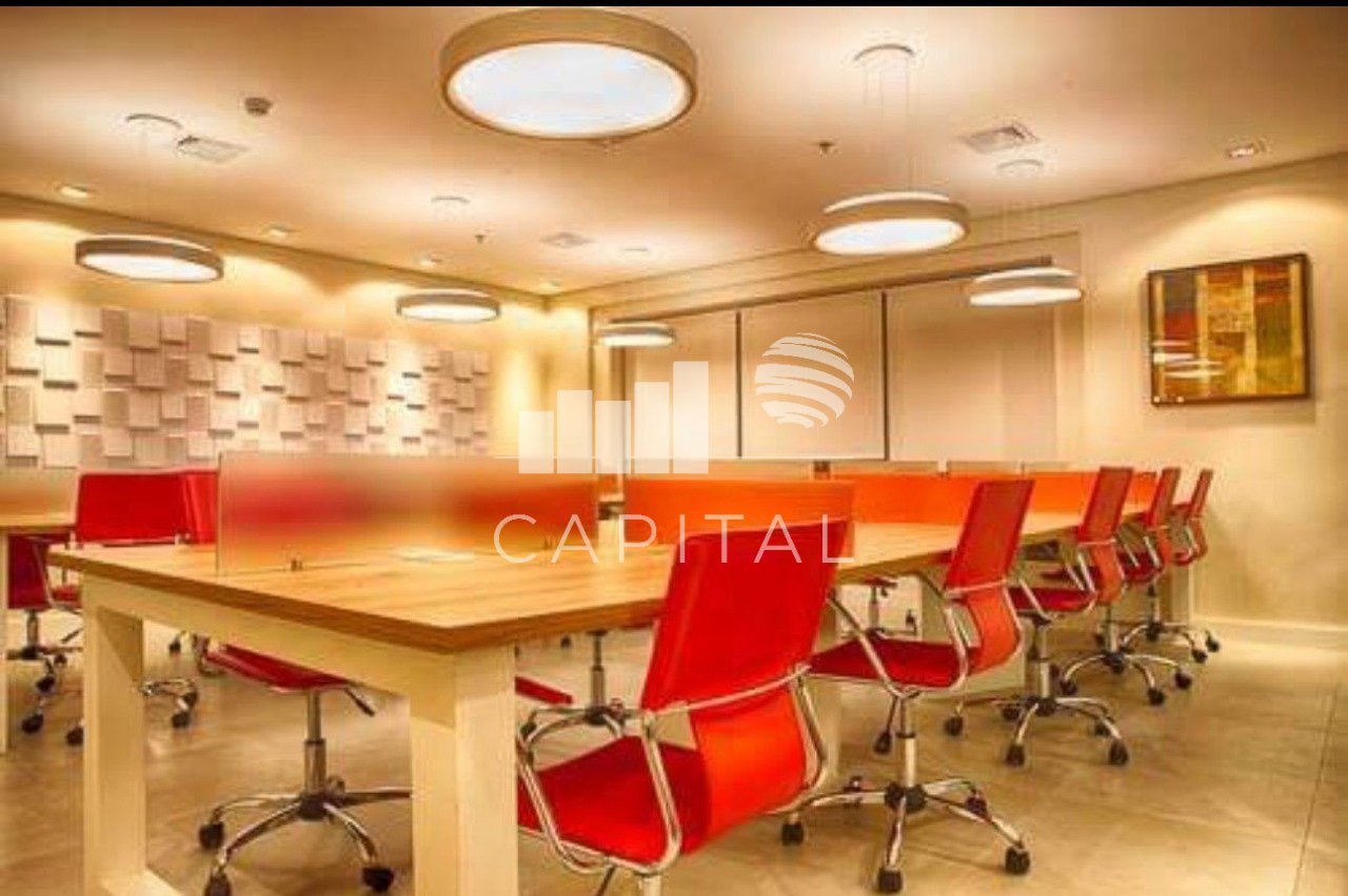 Vendo linda sala comercial totalmente mobiliada no centro de Alphaville, com muito bom gosto, 99 m², ar condicionado. A sala possui piso frio e 1 banheiro. Bancada para até 16 pessoas. Copa, 2 vagas. Portaria 24 horas. O condomínio possui 3 salas de reunião, um mini mercado e farmácia.