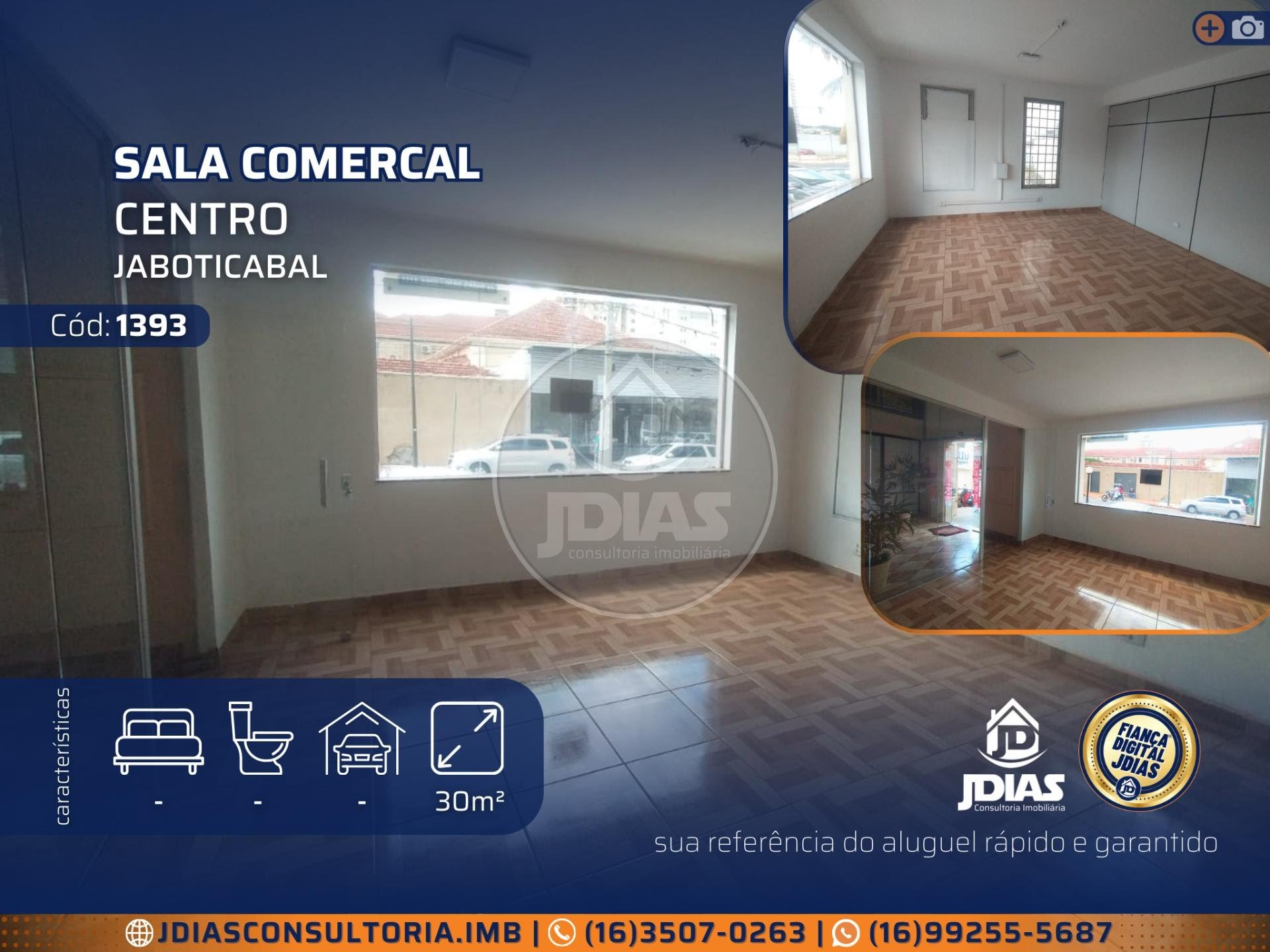 ALUGA-SE<br> Sala Comercial em Centro - Jaboticabal<br> 1 Sala(s)<br> Estacionamento<br> Área construída: 30m² <br> Armário(s): Não possui<br> Diferenciais: Localização/ Segurança / Incluso água, Internet e sala de reunião mediante agendamento.<br> Mobiliado: Não possui<br><br> Mais informações, fotos e valores do imóvel:<br> Link: [site link]<br><br>----------<br><br>Informações para Alugar:<br>• Incluso no aluguel: IPTU / Taxa condominial <br>• Garantia Locatícia: Fiança digital (Sem fiador, zero-burocracia, segurança e rapidez)<br>• Faça uma simulação e saiba se já pode alugar o imóvel.<br><br> Informações do Empreendimento/condomínio:<br>• Principais itens do condomínio: Água / Internet <br>(valores de taxa condominial e validação das informações mediante a verificação e confirmação correta da administradora)<br><br>-------------------------------------------------<br><br>️ Para saber a localização aproximada do imóvel, clique no botão "mapa" ao lado de "fotos".<br><br>ℹ️ Valores e informações descritas sujeito a alterações a qualquer momento, validação mediante a verificação de disponibilidade e confirmação.<br><br> Entre em contato e agende uma visita:<br>⏰ Segunda à sexta das 08h às 18h<br> R. Humberto Biancardi, 163 - Vila Serra, Jaboticabal - SP, 14870-220 (Ao lado da prefeitura)<br> Receba os imóveis recém cadastrados - acesse:<br><br> "Sua referência do aluguel rápido e garantido!"<br>