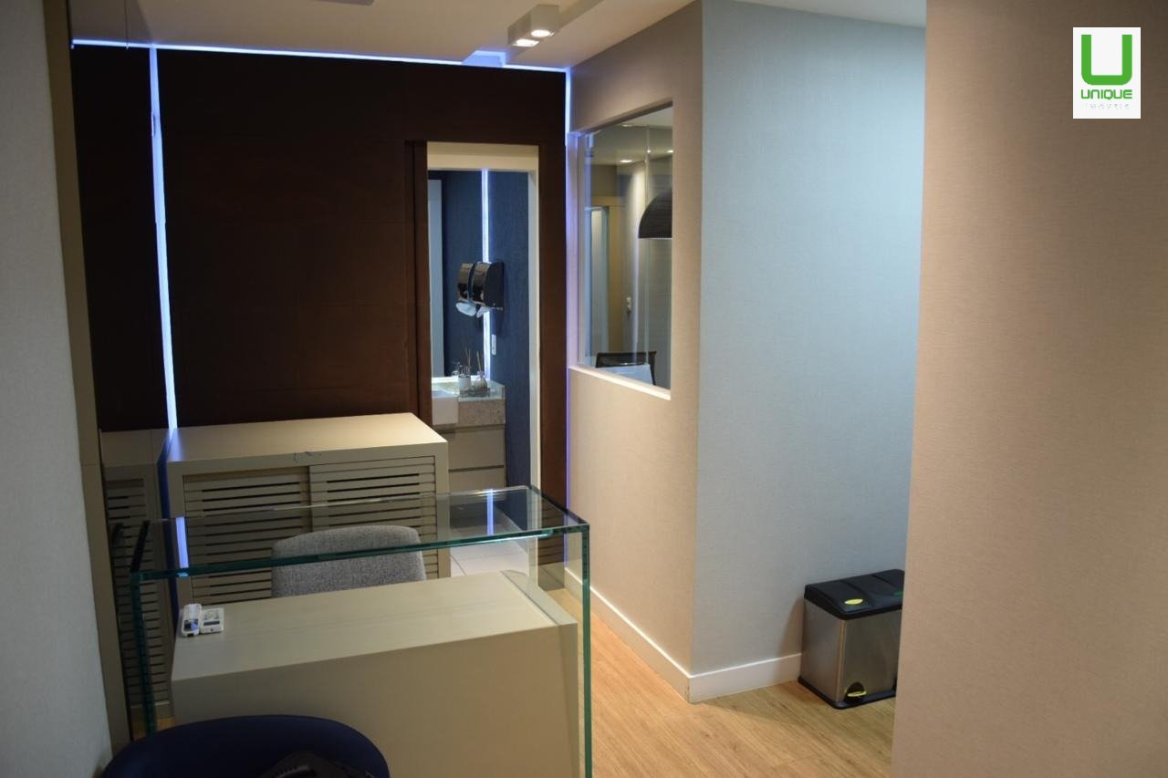 Conjunto de duas salas mobiliadas e com bastantes armários, contando com 1 sala principal, recepção, sala auxiliar, copa com armários e sala de reunião. Banheiros masculino e feminino. Persianas e ar condicionado. Iluminação planejada de altíssimo bom gosto.