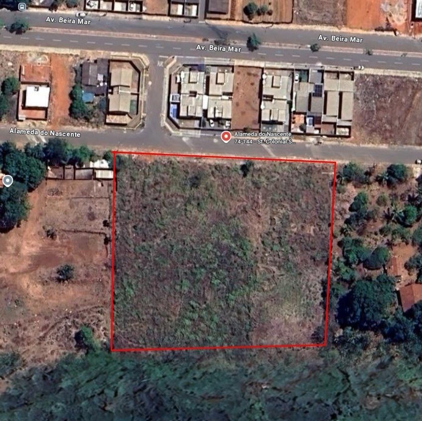 Chácara com área total de 3.797 m², sendo 35 metros de frente, 107 metros do lado esquerdo e 110 metros do lado direito, com córrego nos fundos, localizada dentro da cidade, no bairro Colonial Sul, em Aparecida de Goiânia.