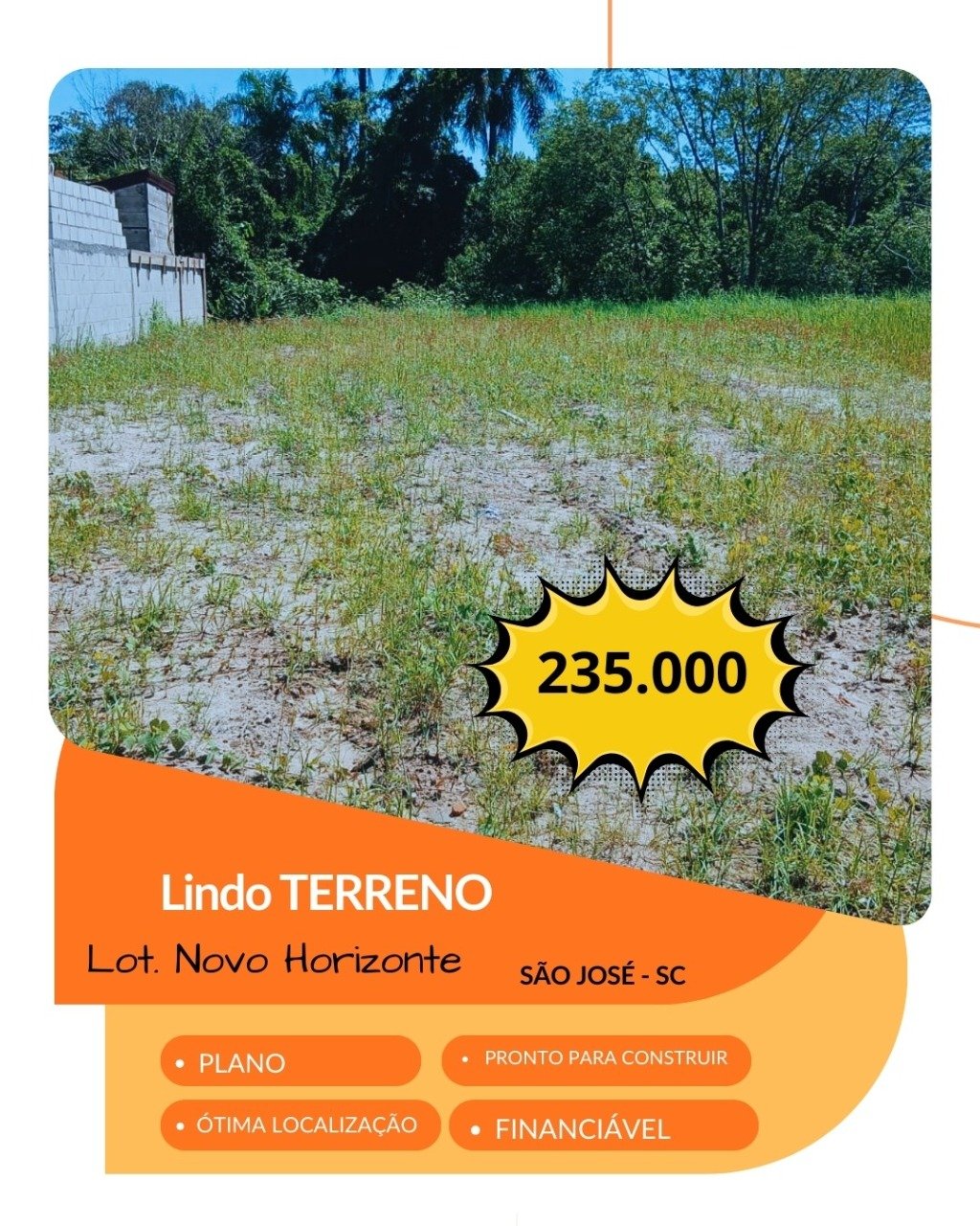 Ótimo terreno, medindo 235m² (10x23). Plano e pronto para construir. Aceita financiamento.
